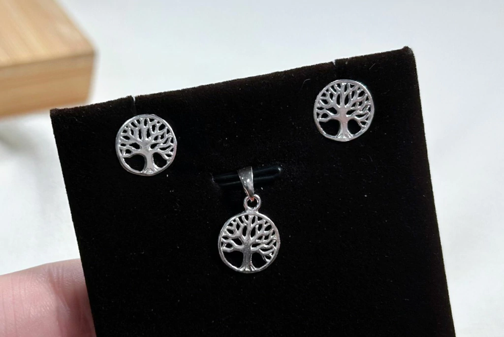Encantador conjunto de brinco e pingente em formato de árvore da vida, símbolo de crescimento e conexão. Cada peça possui um diâmetro de 11 mm, ideal para um visual sofisticado e significativo. Este conjunto não acompanha corrente, permitindo que você personalize com sua corrente preferida para um toque único.