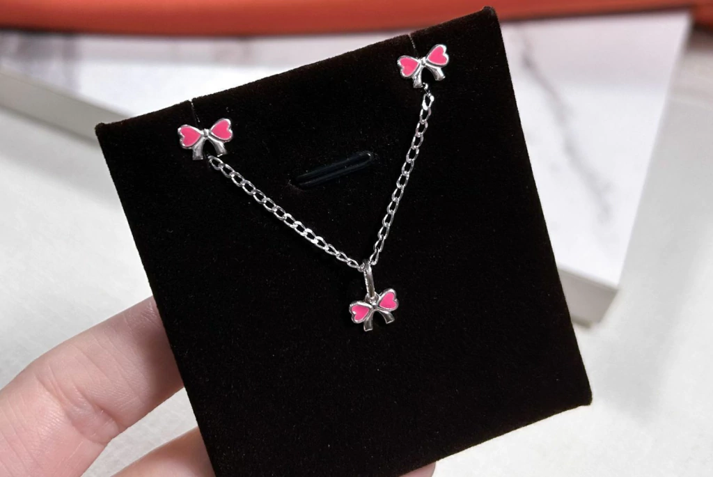 Encantador e delicado, o conjunto infantil com tema de laço rosa é perfeito para adicionar um toque doce ao visual das crianças. Tanto o brinco quanto o pingente medem 5x8 mm, oferecendo um design adorável e feminino. O conjunto acompanha uma corrente de 35 cm com extensor de 5 cm, garantindo um ajuste confortável e ajustável para diferentes tamanhos.