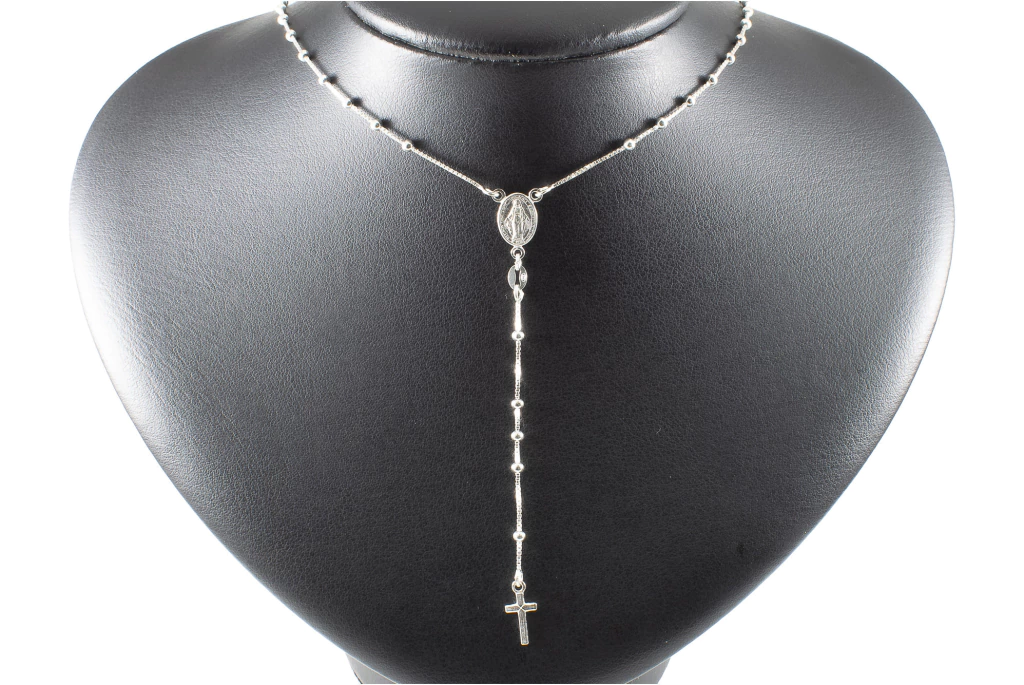 Cuidados e Manutenção: Para manter o brilho do seu colar terço, guarde-o em uma embalagem individual, em local seco e arejado. Limpe com uma flanela suave ou produtos específicos para garantir sua durabilidade.