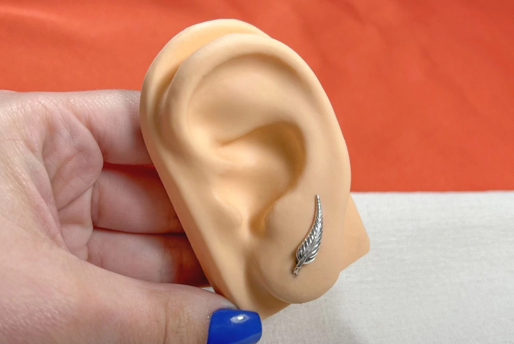 Brinco ear cuff em prata 925 com design de pena, que transmite leveza e estilo moderno ao visual. Uma peça delicada e versátil, perfeita para complementar diferentes looks e ótima opção para revenda.