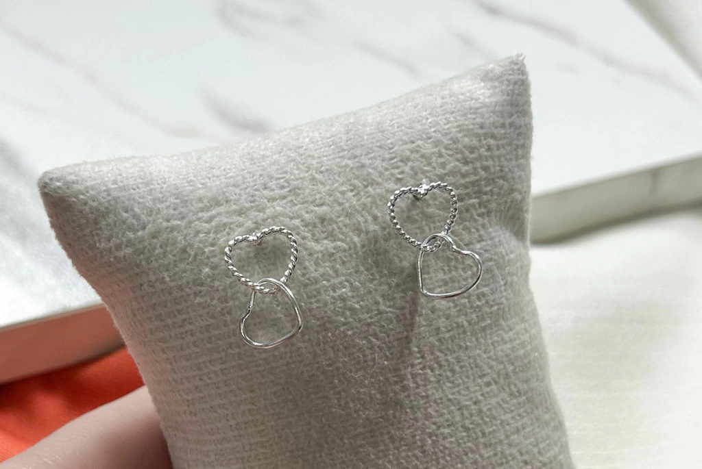 Brinco em prata 925 com design de dois corações, simbolizando amor e conexão em um estilo delicado e encantador. Uma peça versátil e romântica, perfeita para uso diário ou para revenda.