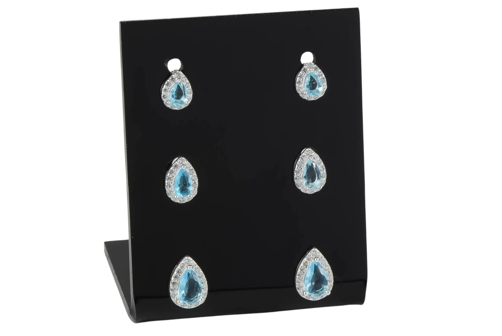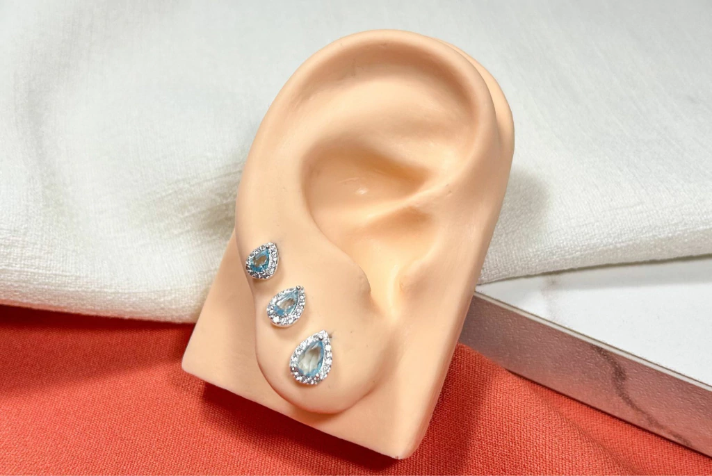 Trio de brincos em formato de gota com zircônia azul em três tamanhos diferentes: 5x6 mm, 6x8 mm e 7x9 mm. Produzido em prata 925, é ideal para composições modernas e versáteis. Uma excelente opção para revenda, com apelo visual marcante e ótima aceitação.