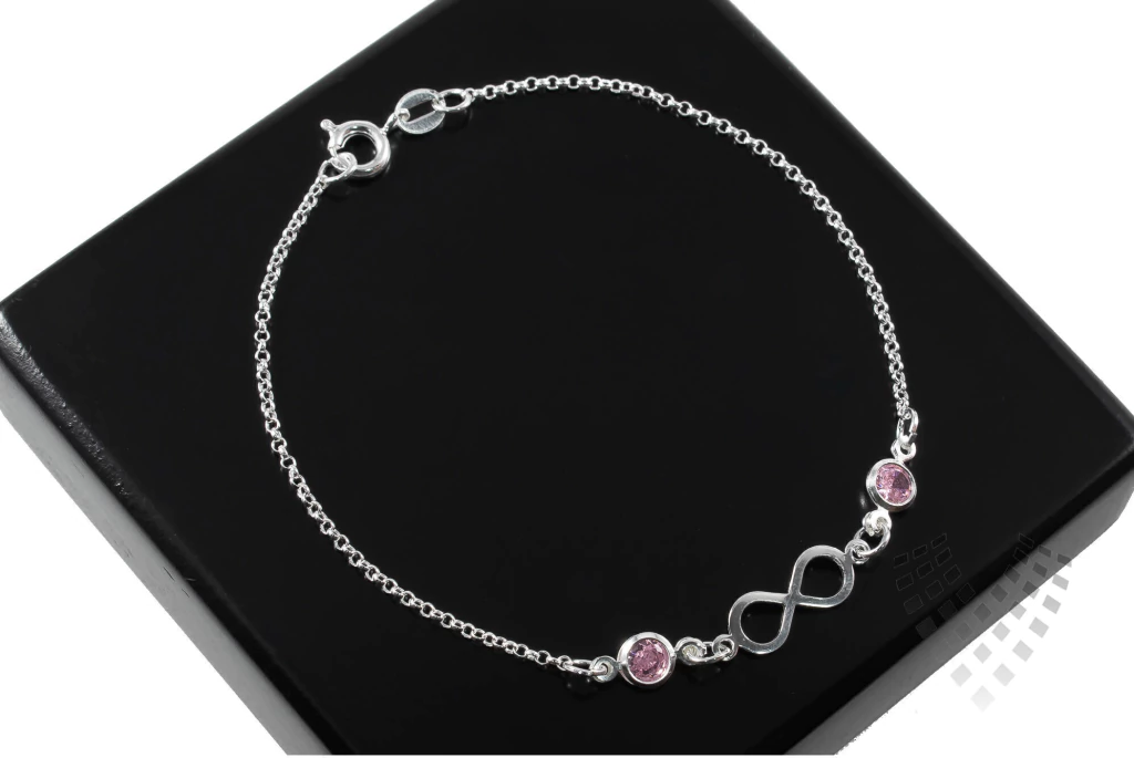 Pulseira em prata 925 com símbolo do infinito e dois cristais rosa claro. Mede 18 cm, sendo delicada, moderna e perfeita para revenda.