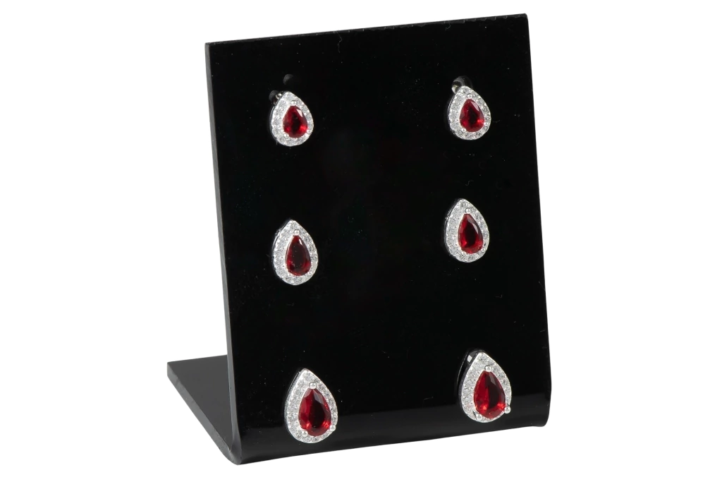 Trio de brincos em formato de gota com zircônia vermelhos em três tamanhos diferentes: 5x6 mm, 6x8 mm e 7x9 mm. Produzido em prata 925, é ideal para composições modernas e versáteis. Uma excelente opção para revenda, com apelo visual marcante e ótima aceitação.