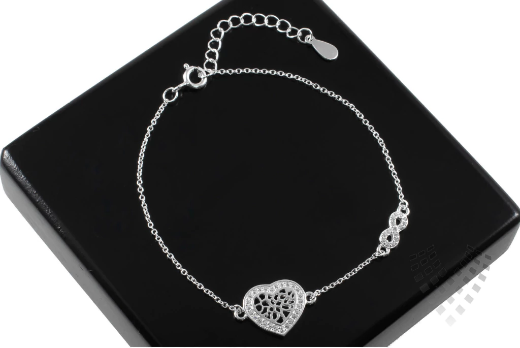 Pulseira em prata 925 com coração e símbolo do infinito adornados por zircônias. Mede 16 cm com extensor de 3 cm, unindo delicadeza e brilho em uma joia perfeita para revenda.