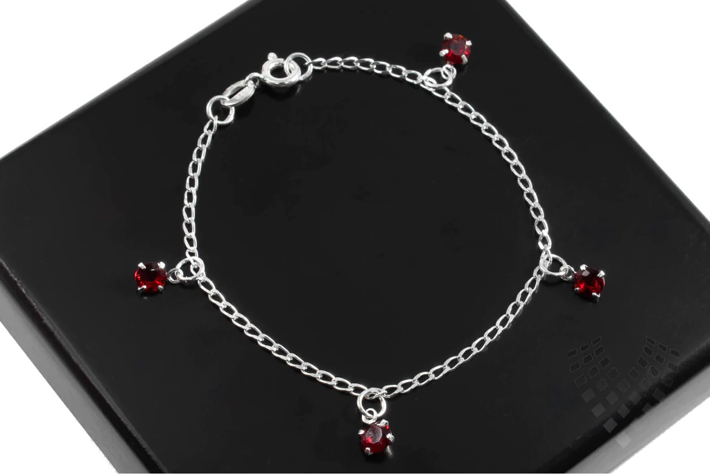Pulseira infantil em prata 925 com quatro cristais vermelhos fixados em garras delicadas, trazendo charme e brilho ao visual das pequenas. Uma joia graciosa para acompanhar em qualquer ocasião. Medida: 14 cm.