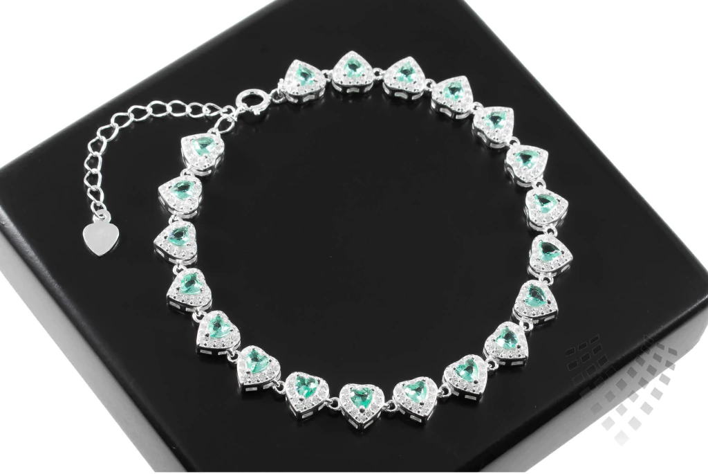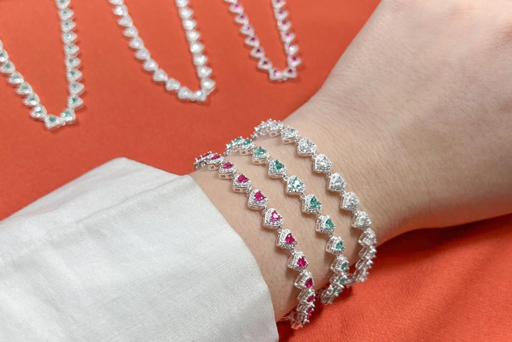 Pulseira em prata 925 estilo Riviera com corações cravejados de zircônias e turmalina, trazendo cor e sofisticação ao visual. Medida: 16 cm com extensor de 4 cm, perfeita para revenda e compor mixes elegantes.