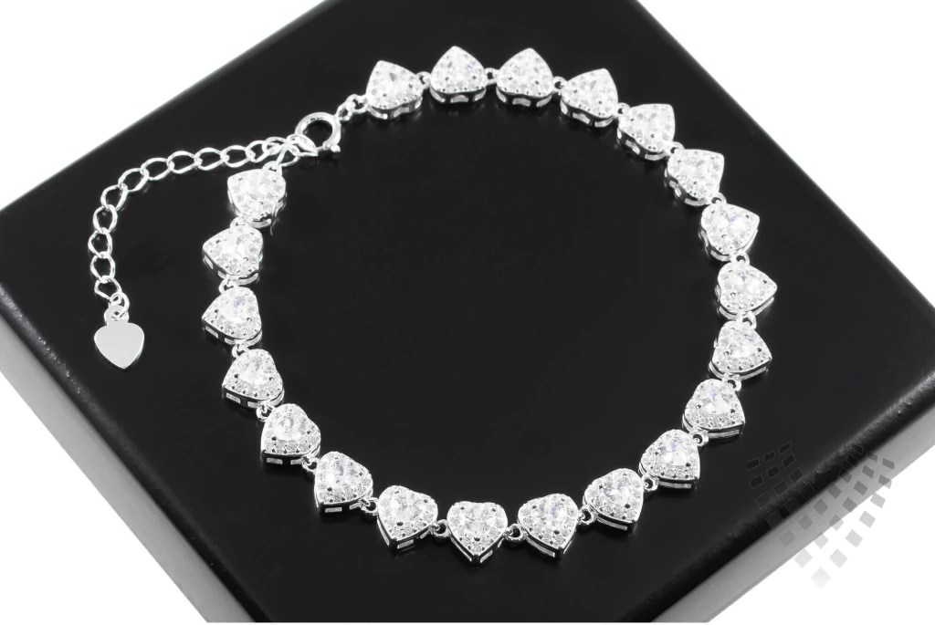 Pulseira em prata 925 estilo Riviera com corações cravejados de zircônias, trazendo cor e sofisticação ao visual. Medida: 16 cm com extensor de 4 cm, perfeita para revenda e compor mixes elegantes.