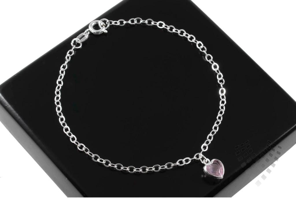 Pulseira em prata 925 com pingente de coração em cristal pink. Mede 18 cm e é delicada, versátil e ideal para revenda.
