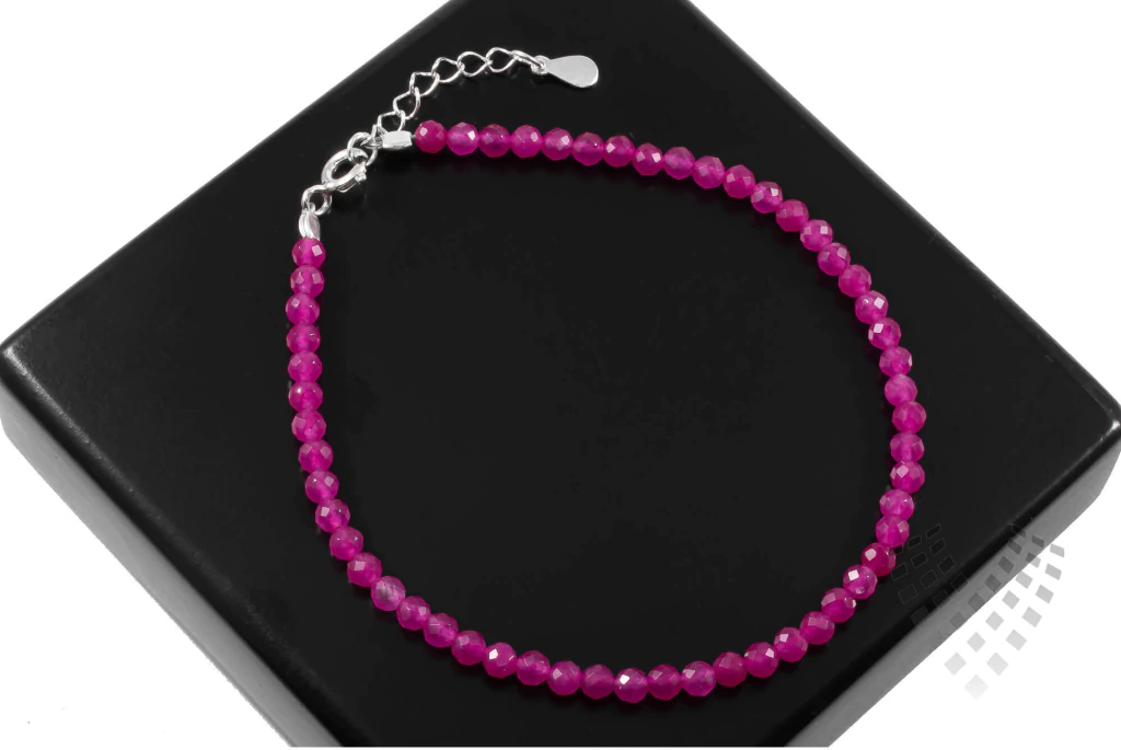 Pulseira em prata 925 com pedras naturais de jade fúcsia, que trazem um toque de cor e energia positiva ao visual. Com 18 cm de comprimento e extensor de 3 cm, é uma joia elegante e versátil, perfeita para o dia a dia e excelente opção para revenda.
