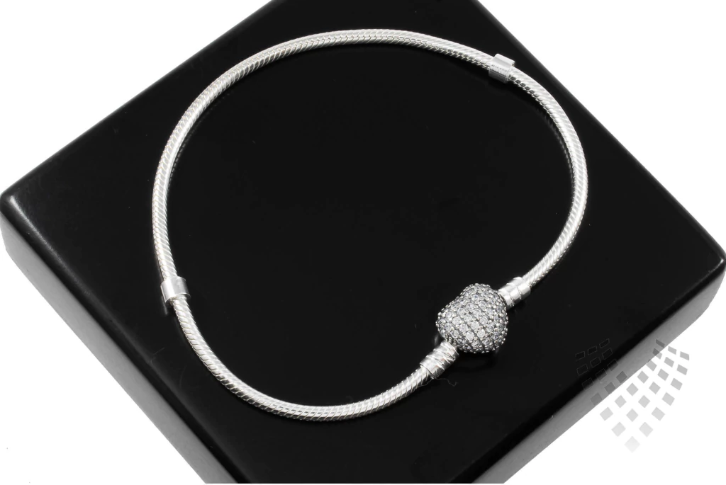 Pulseira semirrígida em prata 925 com espessura de 2 mm e fecho em formato de coração cravejado. Ideal para montar com berloques e criar combinações personalizadas, unindo brilho e delicadeza em uma peça versátil e perfeita para revenda.