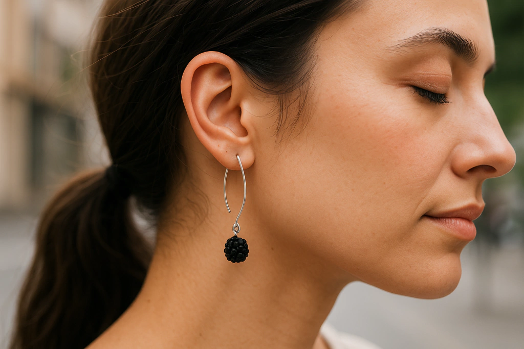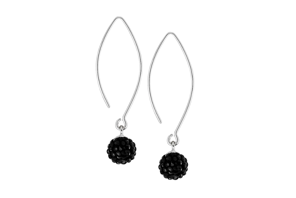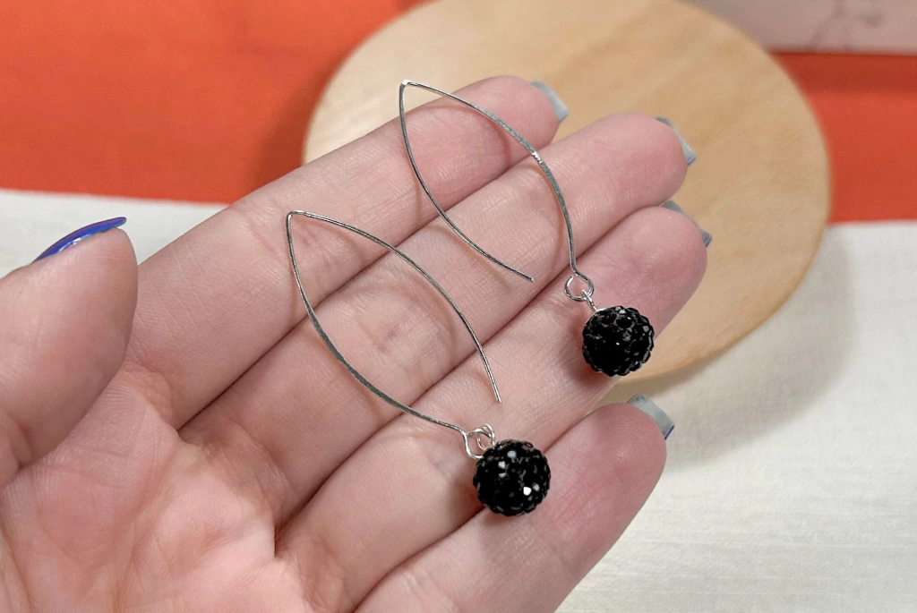 Brinco anzol em prata 925 com bola de cristais preto estilo Mina, que reflete brilho e alegria em cada detalhe. Uma joia cheia de vida, ideal para quem ama um toque vibrante no visual e excelente opção para revenda.