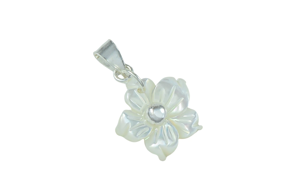 Pingente em prata 925 com delicado formato de flor e madrepérola natural, que reflete brilho suave e elegante. Uma joia charmosa e feminina, ideal para compor colares delicados e excelente opção para revenda.