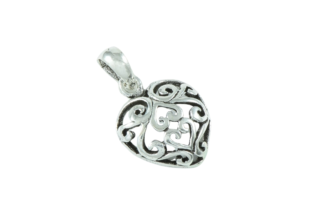 Pingente em prata 925 com formato de coração e adornos em acabamento envelhecido, que destacam seus detalhes artesanais e cheios de personalidade. Uma peça charmosa e simbólica, perfeita para compor colares com estilo e ótima para revenda.