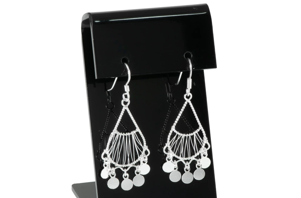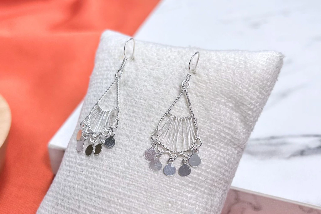 Brinco em prata 925 com design de gota aramado e pequenas medalhas, que traz movimento e delicadeza ao visual. Uma peça charmosa e moderna, perfeita para compor looks elegantes e ótima opção para revenda.