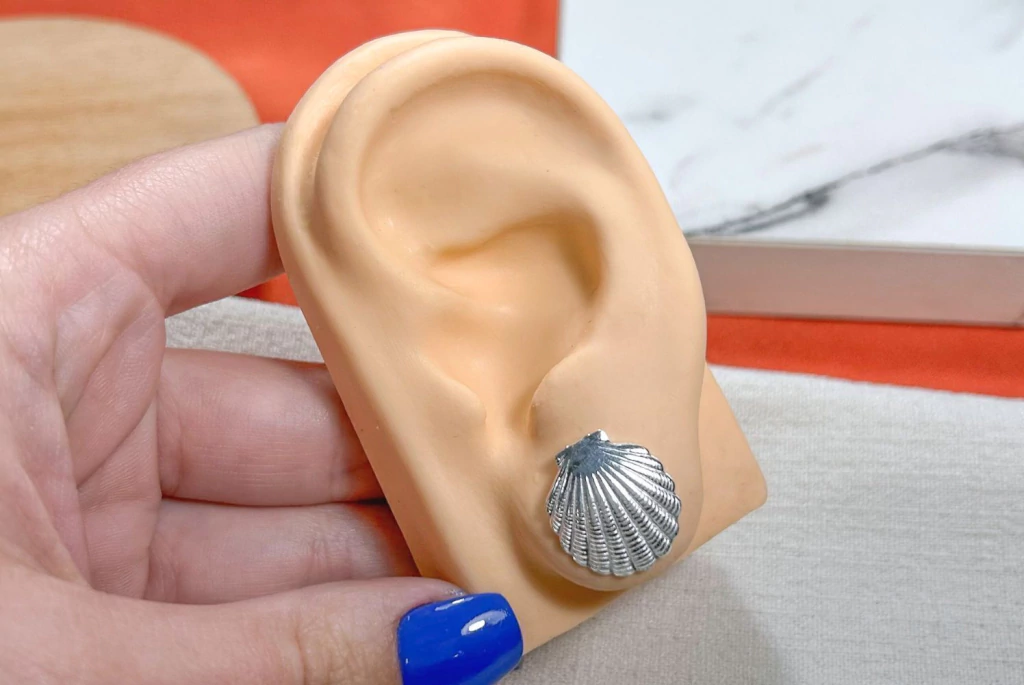 Brinco em prata 925 com delicado formato de concha, que transmite leveza e elegância ao visual. Uma joia charmosa e versátil, perfeita para complementar looks casuais ou sofisticados e ótima opção para revenda.