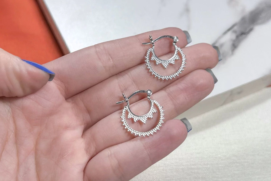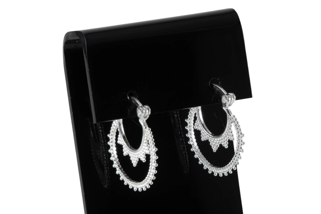 Brinco argola Indiana em prata 925, com design trabalhado que transmite estilo artesanal e sofisticação. Uma peça versátil, perfeita para complementar looks modernos ou casuais e excelente opção para revenda.