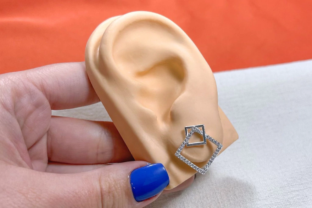 Brinco em prata 925 com design de formas geométricas e detalhes em zircônia, que traz brilho e modernidade ao visual. Uma joia elegante e versátil, perfeita para diversas ocasiões e excelente opção para revenda.