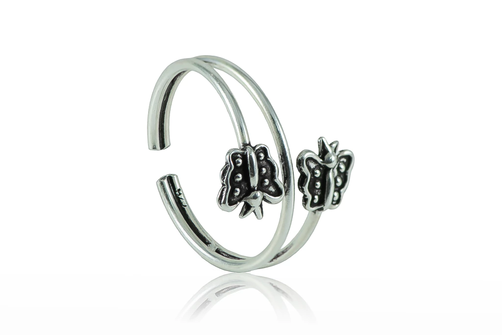 Anel de falange em prata 925 com duas borboletas na parte frontal, transmitindo leveza e delicadeza em cada detalhe. Um modelo encantador, ideal para compor mix de anéis e excelente opção para revenda.