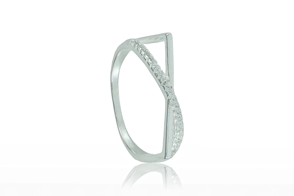 Anel em prata 925 com design reto cruzado e detalhes em zircônias, trazendo modernidade e brilho ao visual. Uma peça elegante e versátil, ideal para mix de anéis ou uso individual, sendo excelente opção para revenda. Disponível em diversos tamanhos.