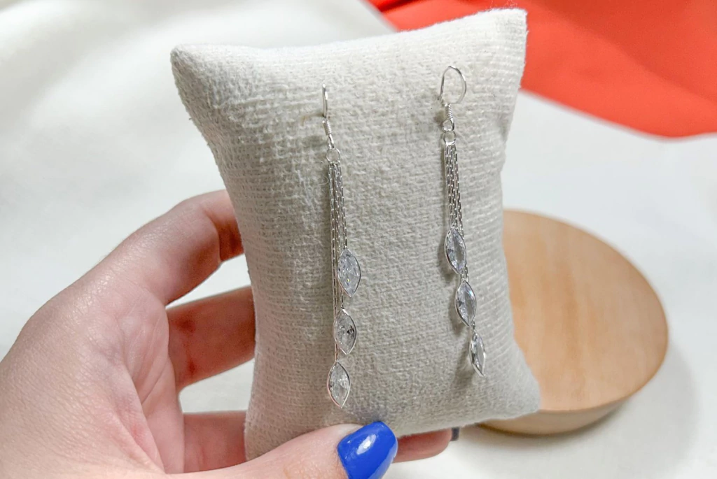 Brinco em prata 925 com 3 correntes e pingentes em formato de navetes zircônia, que adicionam movimento e elegância ao visual. Um modelo moderno e sofisticado, perfeito para ocasiões especiais ou uso diário, sendo excelente opção para revenda.