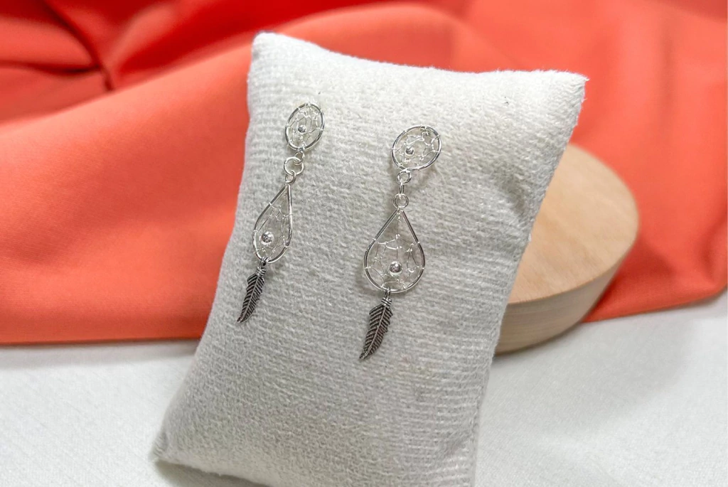 Brinco em prata 925 com design de filtro dos sonhos e detalhe de gota, trazendo delicadeza e um toque místico ao visual. Leve, encantador e excelente opção para revenda, agradando clientes que buscam simbolismo e estilo em uma única peça.