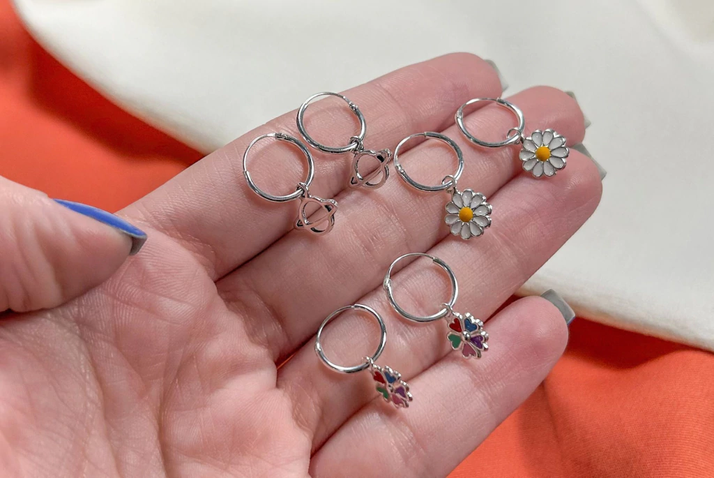 Brinco argola em prata 925 com margarida, delicado e cheio de charme, ideal para compor looks leves e ótima opção para revenda.