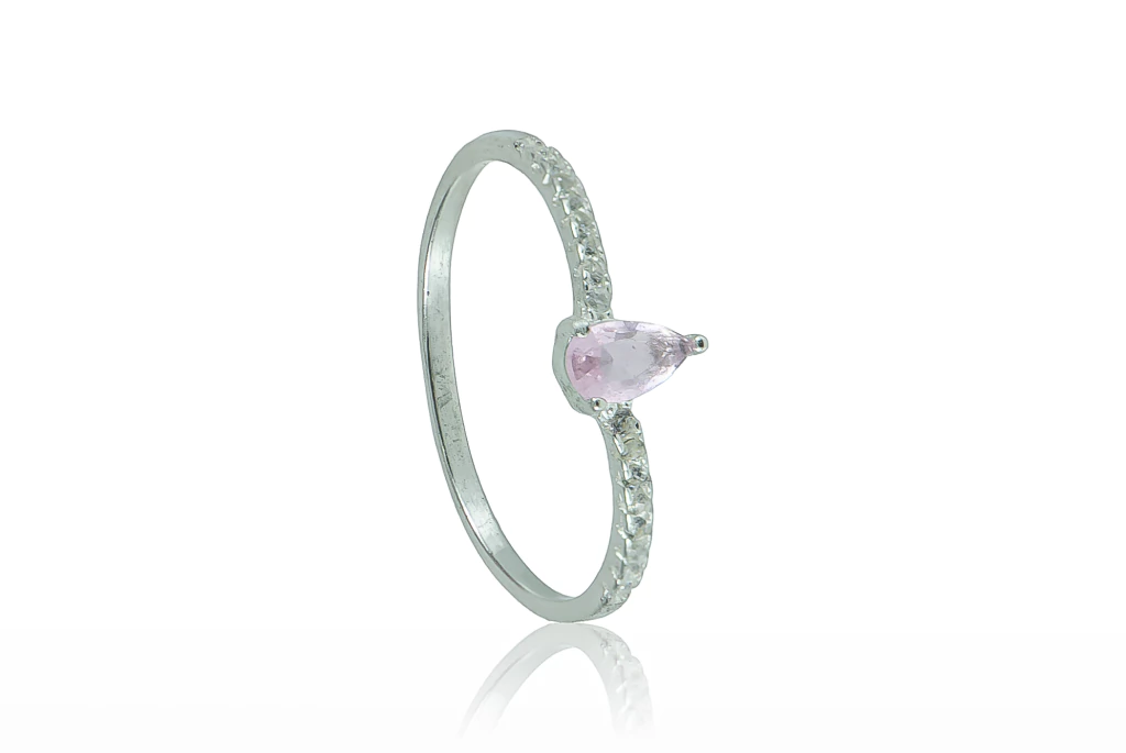 Anel em prata 925 com delicada gota de zircônia rosa claro, emoldurada por pequenas zircônias que realçam ainda mais o brilho da peça. Um modelo elegante, perfeito para valorizar qualquer composição e ideal para revenda. Disponível em diversos tamanhos.