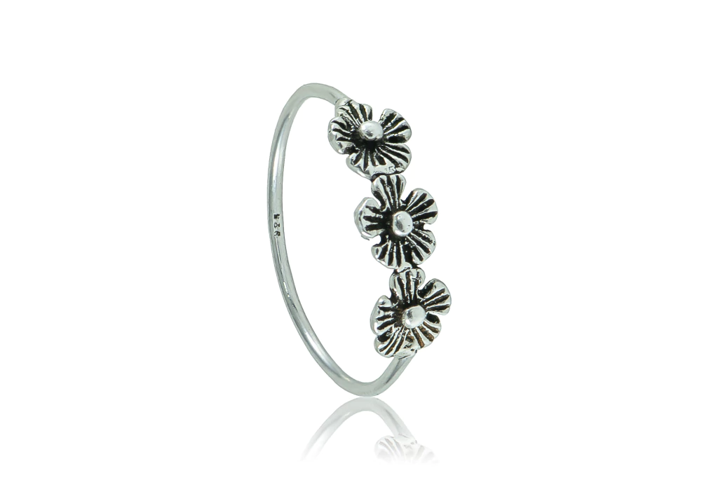 Anel em prata 925 com três margaridas delicadas, trazendo um visual leve e feminino. Perfeito para compor mixes cheios de charme e excelente opção para revenda. Disponível em diversos tamanhos.