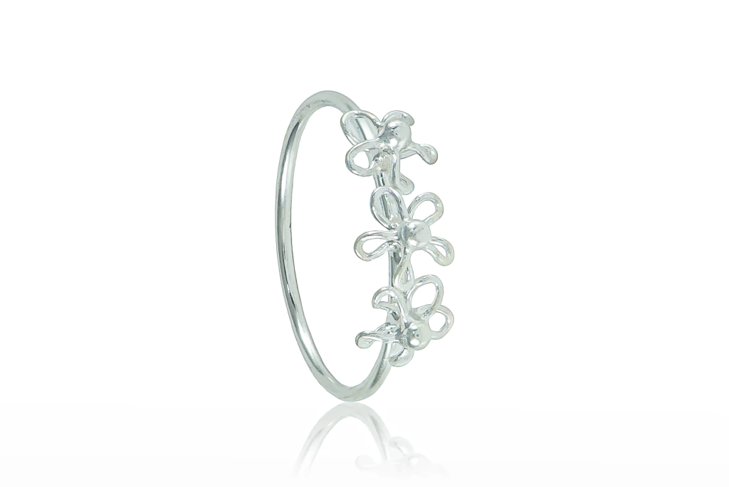 Anel em prata 925 com três flores vazadas, delicado e cheio de charme. Um modelo leve e feminino, perfeito para compor mixes e ótimo para revenda. Disponível em diversos tamanhos.