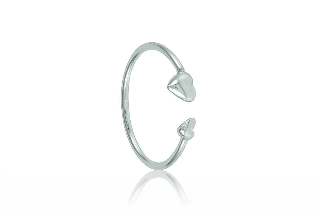 Anel em prata 925 com design aberto e dois corações frontais, romântico e delicado. Uma peça charmosa para o dia a dia e excelente para revenda. Disponível em diversos tamanhos.