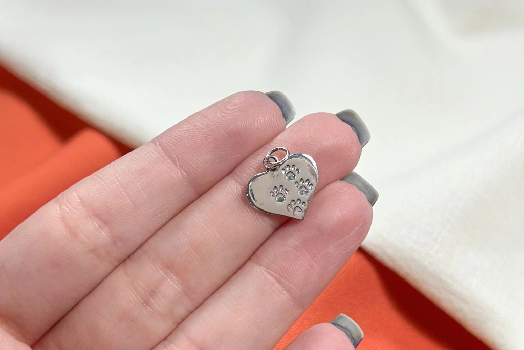 Pingente em prata 925 com coração e patinhas, delicado e fofo, perfeito para quem ama animais e excelente opção para revenda.