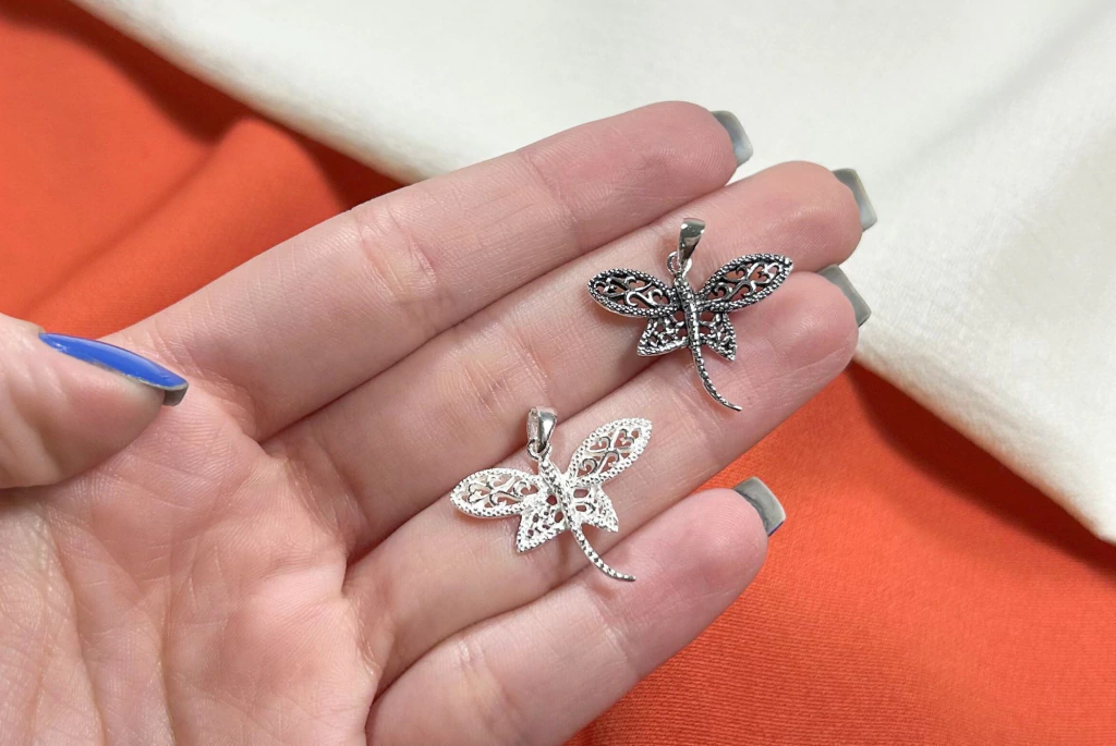 Pingente em prata 925 com libélula, delicado e leve, perfeito para complementar correntes com estilo e ótima opção para revenda.