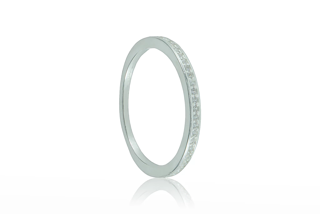 Anel meia aliança em prata 925 com zircônias alinhadas, brilho delicado e elegante, perfeito para complementar qualquer look e excelente opção para revenda.