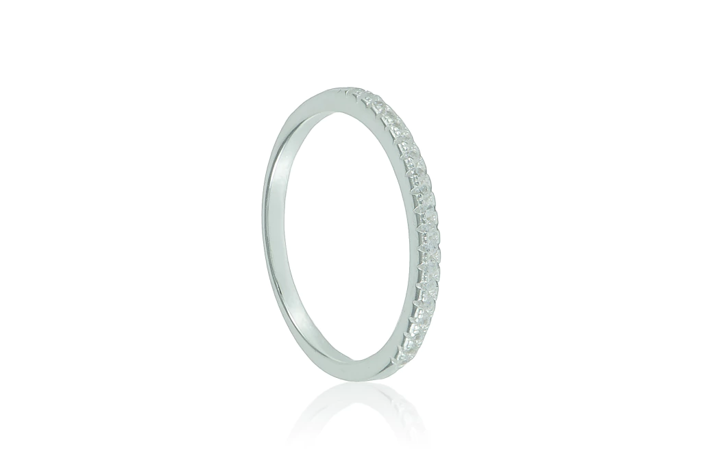 Anel meia aliança em prata 925 com zircônias alinhadas, brilho delicado e elegante, perfeito para complementar qualquer look e excelente opção para revenda.