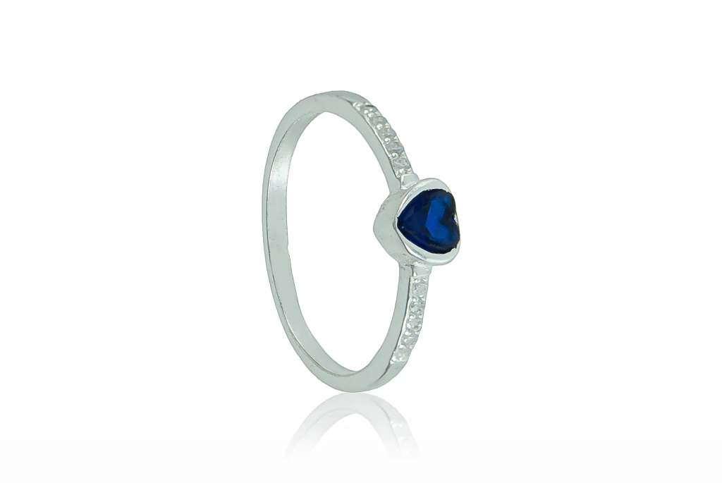 Anel em prata 925 com coração azul central e meia aliança de zircônias, cheio de brilho e charme, ideal para destacar o look e excelente para revenda.