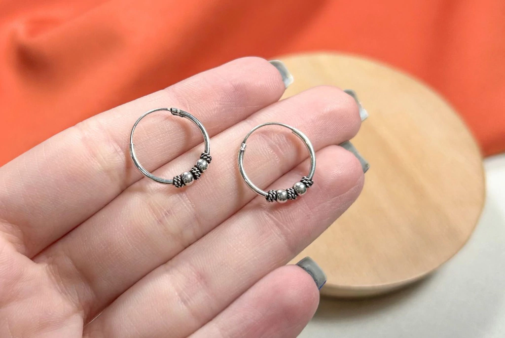Brinco argola em prata 925 com duas bolinhas no estilo Bali, moderno e delicado, ideal para valorizar qualquer look e excelente opção para revenda.
