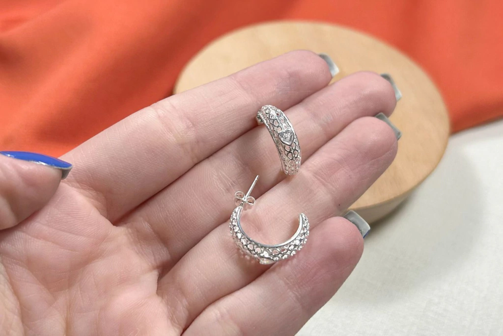 Brinco argola em prata 925 3D com coração de zircônia, moderno e delicado, ideal para destacar o visual e excelente opção para revenda.