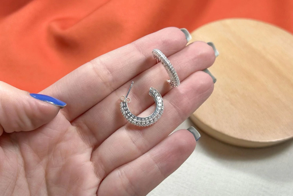 Brinco argola em prata 925 3D e duas fileiras de zircônias, moderno e sofisticado, perfeito para iluminar o visual e excelente opção para revenda.