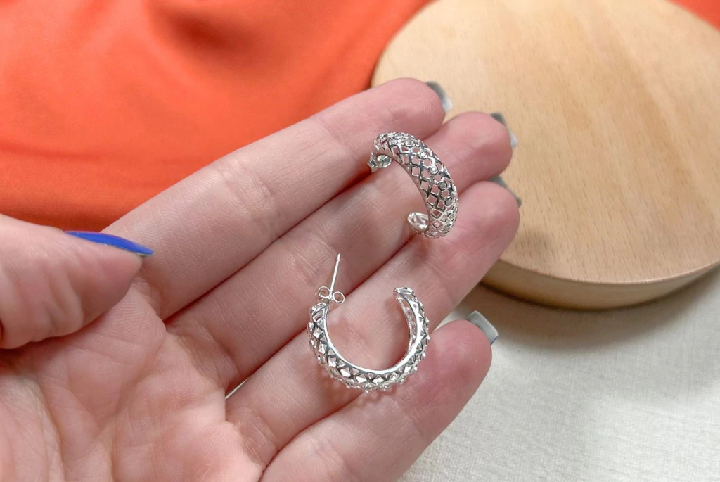 Brinco argola em prata 925 com design 3D e zircônias salpicadas, delicado e sofisticado, ideal para dar brilho ao visual e excelente opção para revenda.