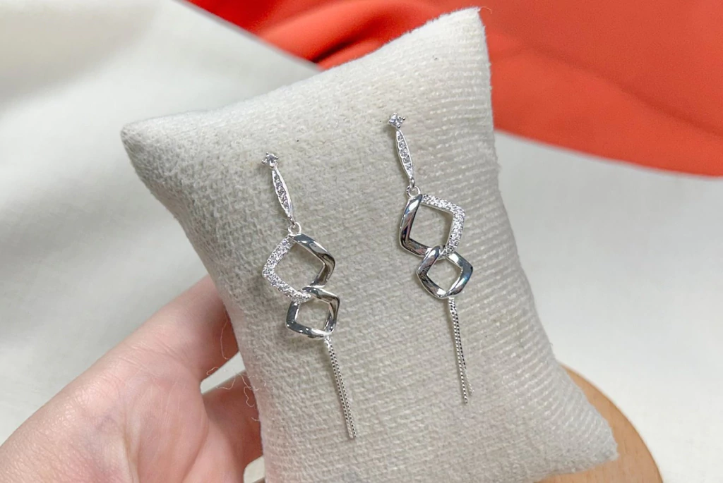 Brinco em prata 925 com dois losangos conectados com corrente na ponta, moderno e elegante, perfeito para valorizar qualquer look e excelente opção para revenda.