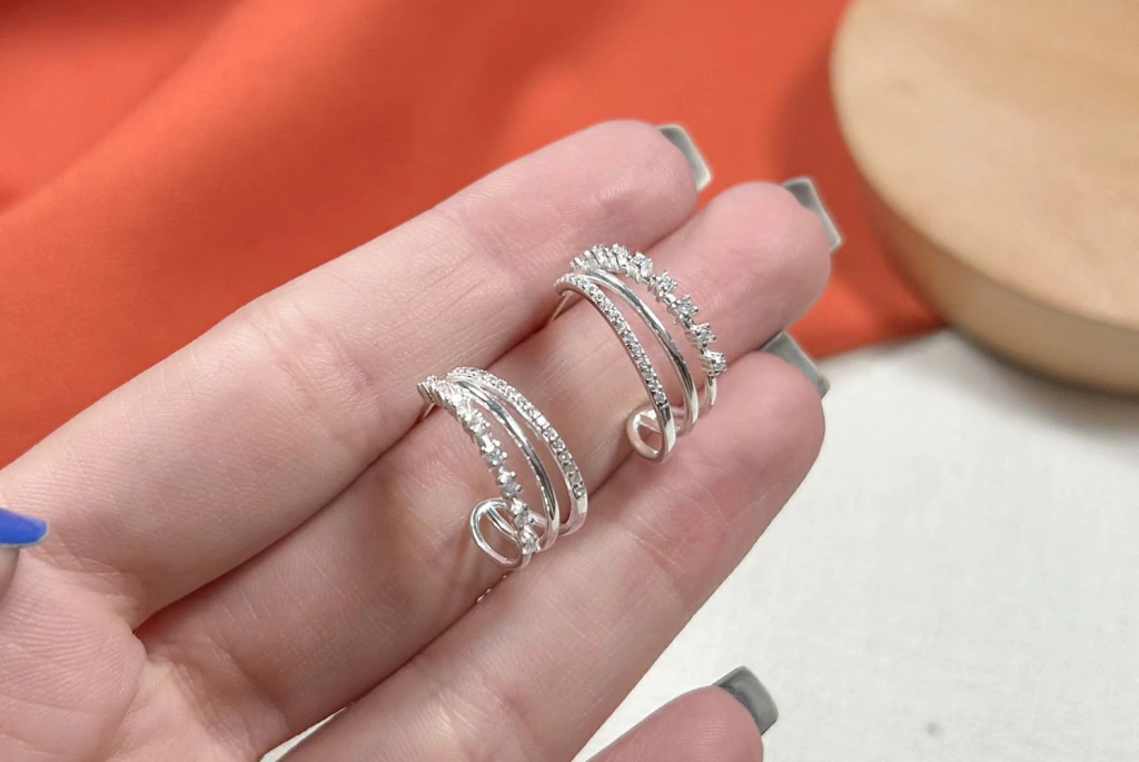 Brinco argola em prata 925 com três linhas, sendo uma lisa e duas cravejadas de zircônias, moderno e sofisticado, ideal para valorizar o visual e excelente opção para revenda.